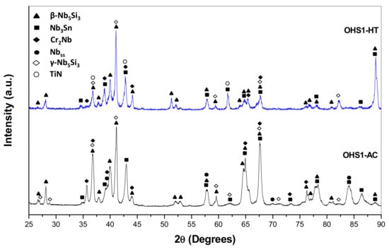 X-ray diffractograms (XRD) of the alloy OHS1 in the as-cast (AC) and heat-treated (HT) conditions. The XRD data agreed with the data from the following JCPDS (International Center for Diffraction Data) cards: (34-370) for Nbss, (30-0875) for βNb5Si3, (65-4327) for Ti-rich Nbi5Si3, (19-875) for the Nb3Sn, (47-1637) for the NbCr2 Laves phase, and (38-1420) for the TiN.