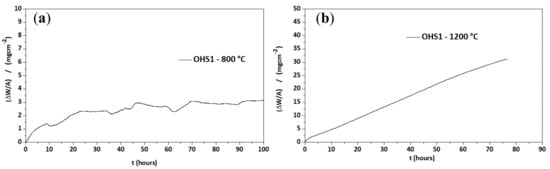 Thermogravimetry (TG) plots of the alloy OHS1 for isothermal oxidation in air at (a) 800 and (b) 1200 °C.