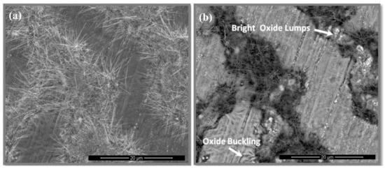 Three main features were observed in the scale surface, namely, a flat oxide with small round oxide particles that mostly formed in the polishing marks, oxide whiskers, and bright lumps that developed around the oxide whiskers (Figure 5). Figure 5a,b show the scale surface under secondary electron (SE) and BSE imaging conditions, respectively. The scale on top of the Nb5Si3 silicide was thin. However, the apparently adherent scale presented some buckling near the grain or phase boundaries (Figure 5b). The length of the oxide whiskers was about 10 µm.