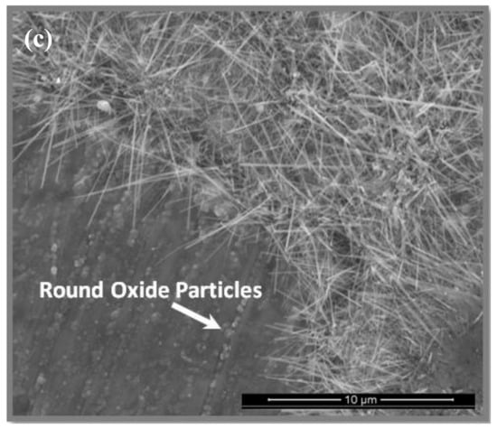 After the isothermal oxidation in air at 1200 °C, there was no scale spallation; instead, the specimen was covered by a light-brown scale with well-defined edges and some long cracks in the scale (Figure 10d). Typical images of the surface of the scale are shown in Figure 10. The SE image (Figure 10a) shows a continuous and bulged scale with some small cracks. The images in Figure 10b,c show the surface at higher magnification and it is possible to observe particles with different morphology and some porosity. The scale consisted of different oxides (Figure 10c). There were coarse and bright oxide particles, small and dense gray oxide particles, and gray protruding rods.