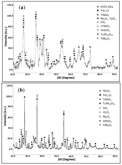 It is well known that specific alloying additions in Nb enhance its oxidation resistance [11,16,17]. The latter increases with additions of Al, B, Cr, Ge, Hf, Mo, Si, Sn, and Ti in Nb-silicide-based alloys [5,10,18,19,20,21,22,23,24,25,26], in which Si is the key addition needed to form silicide(s) and for oxidation. Silica can be stable to higher temperatures than alumina, has a lower activation energy for oxygen diffusion, and could be more effective than alumina at higher temperatures [27]. Amorphous silica has some fluidity to heal cracks in the scale. Alumina is crystalline with virtually no fluidity. The oxides of the alloying elements Al, Hf, and Ti are even more thermodynamically stable than silica. The latter has virtually no solubility with Nb2O5 in the solid state. B2O3 or GeO2 in silica gives (a) a glass with lower viscosity at low temperatures where the resulting higher fluidity can improve the self-healing of the scale, and (b) a higher coefficient of thermal expansion (CTE) than pure silica [28]. The Nb-silicide-based alloys form complex oxide scales during oxidation [10,18,22,23,25,26,29]. The binary phase diagrams for these oxides with Nb2O5, which has a lower (about 1550 °C) melting point than Nb (2477 °C), indicate eutectic formation [30], which requires that the maximum useful application temperature should be lower that the eutectic temperatures.