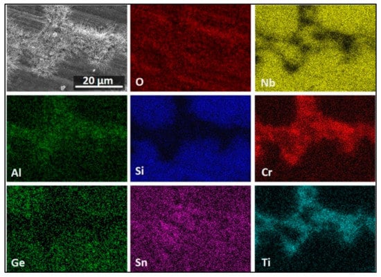 The X-ray elemental maps in Figure 11 show an uneven elemental distribution in the scale surface. There was no Ge in the scale surface. The scale over the three-phase areas (NbCr2, Nbss, and Nb3Sn) was rich in Cr, Ti, Al, and Sn. Figure 11 also shows TiO2 in the form of coarse whiskers or rods on top of the three-phase region where there was also Nb, Cr, Al, and Sn. However, the latter could be from oxides formed right below the oxide rods, as it was observed in the scale that formed at 800 °C. There were Nb oxides on top of the Nb5Si3 with low Si on the surface of the oxide. There was high Nb content in all the oxides, but the Nb concentration decreased when the oxides were rich in Ti, Cr, Al, and Sn.