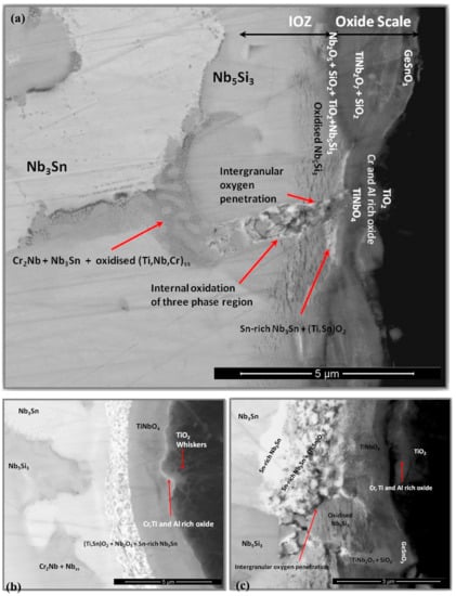 The microanalyses confirmed that the Nb3Sn formed a multi-layered complex oxide that consisted of at least three oxide layers; the outermost part contained TiO2 whiskers and (Sn,Ti)O2 lumps, then underneath was a Ti-, Cr-, and Al-rich oxide layer, and just below another oxide layer that was mainly composed of TiNbO4. Some areas of this layer also contained CrNbO4, SiO2, and perhaps some AlNbO4 resulting from the oxidation of the Al-containing Laves phase that was present in the vicinity (Figure 8b). The substrate/scale interface was characterized by the internal oxidation of the Nb3Sn and the formation of (Sn,Ti)O2 precipitates. The average composition (at.%) of these areas was 45O-27Nb-9Ti-10Sn-2Si-1Cr-4Al-2Ge. Just below the IOZ the composition of the Nb3Sn was 44.6Nb-27.2Ti-9.7Sn-3Si-6.9Cr-6.6Al-2Ge.
