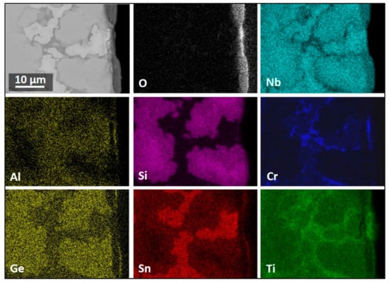 The surface of the scale that formed on top of the Nb5Si3 phase was enriched in Ge and Sn in the outermost part, which is consistent with the high Ge and Sn contents observed in the elemental maps in Figure 7. Toward the inner part of the scale, the main components were the O, Nb, and Ti from titanium niobates. The oxide formed on top of the Nb5Si3 was rich in Si. The oxide formed on top of the three-phase region was rich in Ti and O. In these areas, the whiskers formed. The oxide below the whiskers was rich in Cr, Al, and Ti, followed by an oxide layer rich in O, Nb, and Ti with minimal presence of Ge (Figure 9). The Nb3Sn at the substrate/scale interface was richer in Sn compared with the rest of the alloy.
