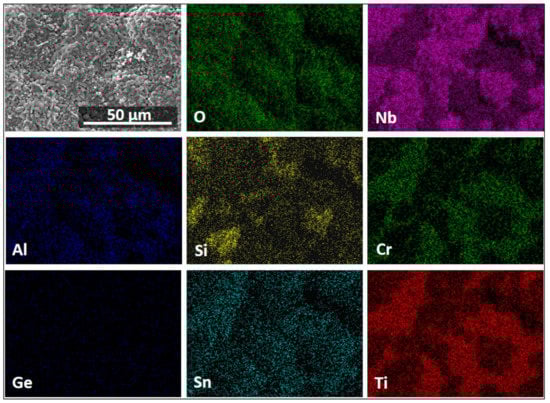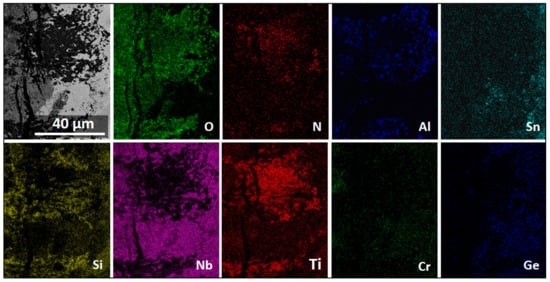 Figure 12 shows a high Nb, Si, and Ti presence in the scale. The Nb was mostly found in the Ti2Nb10O29 and (Cr,Ti)NbO4 oxides, in agreement with the GXRD data. Low-Nb-content regions near the scale/substrate interface were rich in TiO2 or SiO2. Chromium was found mostly dissolved in the TiNbO4 oxide with higher content at the scale surface. The IOZ was depleted in Cr. There was Si present all over the scale in glassy SiO2 and dissolved in (Ti,Cr)NbO4. The Al content was practically the same in most of the scale and in the substrate; however, in some parts of the scale, the AlNbO4, (Cr,Al)NbO4 and Al2O3 around Ti-rich oxides presented a higher Al content. The scale did not contain Ge but had some Sn in it, and the IOZ presented a considerable enrichment of these two elements, particularly Sn, with a considerable reduction of Cr and Ti contents in these areas.