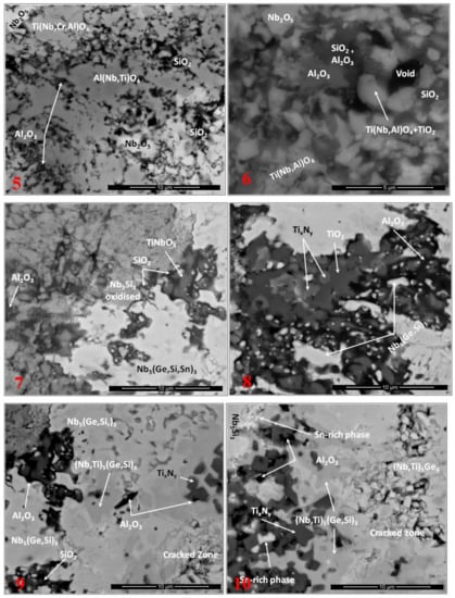 In the Nb2O5–GeO2 system, partial melting was observed for 85 mol.% Nb2O5–15 mol.% GeO2 above 1090 ± 10 °C [74]. This would suggest that some liquation might have occurred in the scale of ZF6 that contained both these oxides, which were not present in the scale of OHS1. Thus, it is proposed that the simultaneous addition of Ge and Sn in the alloy OHS1 resulted in non-spallation of the scale that formed at 1200 °C because (a) the scale was able (i) to relax structurally owing to it containing AlNbO4 with low Cr concentration, and (ii) to respond in a “measured” way to stresses arising for temperature gradients owing to it containing SiO2, Al2O3, TiO2 and SnO2, and Ti2Nb10O29 with TiNb2O7, and AlNbO4, and (b) there was no liquation in the scale.