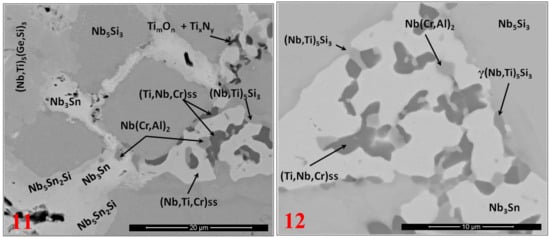 The Nbss and C14-NbCr2 Laves phase were present at low volume fractions and were observed in the areas of dark contrast, where it was not possible to observe grain or phase boundaries. The analysis data for the Laves phase is in agreement with that from previous research [15,44]. It is likely that the analysis data of the Nbss is not accurate owing to the size of this phase. The Nbss was rich in Ti, with the concentrations of the latter in agreement with previous research [42,45,46], but unusually rich in Cr, the concentration of which was higher than the maximum solid solubility of Cr in Nb (about 24 at.%). According to previously published data about the Nbss, for the Ti concentration given in the Table 1, the Cr content should be about 15 at.% [45]. The high Si concentration in the Nbss was out of step with most of the data in the literature but in agreement with the data for the Nbss in Ta containing Nb-24Ti-18Si-5Al-xCr-6Ta alloys (x = 5, 8) [46]. The solid solubility of Si in Nbss is, in general, higher in Sn- or Ge-containing Nb-24Ti-18Si-based alloys [32,33,34], compared with alloys without these two elements. The solubility for Ge or Sn in the Laves phase was very low and slightly lower than that in alloys with only Sn [32,33] or Ge [34,40] additions.