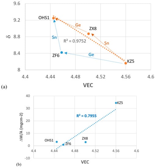 Figure 15a shows (i) that the additions of Ge or Sn individually or simultaneously resulted in a decrease or increase, respectively, of the parameters VEC and δ, in agreement with NICE [10], (ii) that the addition of Ge in ZF6 resulted in a significant decrease in VEC with a small increase in δ, and (iii) that the addition of Sn in OHS1 resulted in a small decrease in VEC and a significant increase in δ. Figure 15b shows that the additions of Ge or Sn individually or simultaneously resulted in lower VEC values and lower weight changes compared with the alloy KZ5, in agreement with NICE [10].