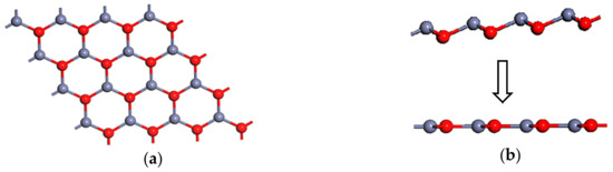 Graphene-like ZnO ML with 4 × 4 × 1 supercell. (a) The top view, (b) the side view of the original and the optimized structure.