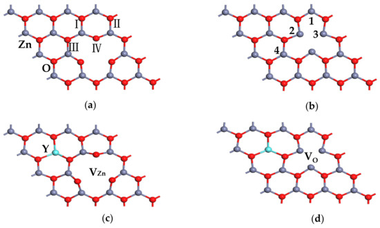 Figure 2 shows the formation energies of ZnO MLs with and without Y or vacancy. As shown in the figure, all formation energy values of Y single-doped ZnO ML were negative, indicating that Y-doped ZnO ML can spontaneously form in the experiment. The formation energy value of Y single-doped ZnO ML changed from −1.428 eV to −0.188 eV with increasing Y concentration. Hence, ZnO ML can be inferred to be the most stable system when the doping concentration of Y is 6.25 at.%. Besides this, the formation energy of VZn-ZnO was close to that of VO-ZnO, which were both positive. This finding indicates that the systems are unstable, and VO-ZnO seems less unstable than VZn-ZnO. Hussain et al. [57] reached a similar conclusion by studying ZnO nano sheets. Therefore, the 4 × 4 × 1 supercell model was chosen for ZnO ML with Y and vacancy. The formation energy values of Y-doped ZnO ML with VZn or VO were positive, indicating the instability of the systems. Figure 3a–d show the optimized structures of ZnO ML with VZn, ZnO ML with VO, ZnO ML with Y and VZn, and ZnO ML with Y and VO, called VZn-ZnO, VO-ZnO, Y-VZn-ZnO, and Y-VO-ZnO, respectively.