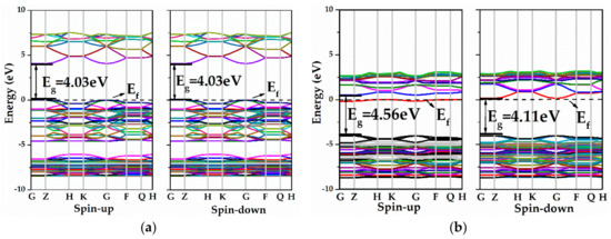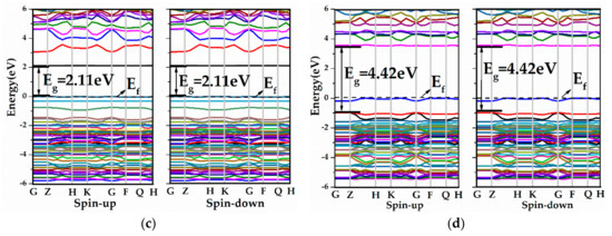 The calculated band structures for pure ZnO ML and ZnO MLs with yttrium or vacancy (Y-ZnO, VZn-ZnO, VO-ZnO) are presented in Figure 4. From Figure 4a,b, both valence band maximum (VBM) and conduction band minimum (CBM) were situated at the G point, indicating a direct bandgap. In Figure 4a, the bandgap of pure ZnO ML (4.03 eV) is greater than bulk ZnO (3.37 eV) [12], which can be explained by the quantum confinement effects, and it was confirmed theoretically and experimentally [59]. In addition, the energy band structures of the spin-up and spin-down components were symmetrical, indicating that the pristine ZnO ML is a non-magnetic semiconductor. From Figure 4b, Y-ZnO is a direct bandgap semiconductor with a bandwidth of 4.56 eV, which is larger than that of ZnO ML. It was noted that the Fermi level of Y-ZnO moved up and located approximately at the CBM, which produced a degenerate n-type semiconductor. This degenerate n-type semiconductor showed the Burstein–Moss effect [20]. A new impurity level appeared because of Y doping, and this impurity was located near the Fermi level in the energy band structure of the spin-up channel. The impurity level can serve as an effective recombination center and increases the separation rate of e- and h+ when ZnO is illuminated by a light source. In addition, the energy band structures of the spin-up and spin-down channels were asymmetrical, implying that Y-ZnO is a magnetic semiconductor. Figure 4c clearly shows that the Fermi level of VZn-ZnO moved slightly to the lower energy level, indicating that VZn-ZnO is a degenerate p-type semiconductor, and shallow acceptor states were created around the Fermi level in the VBM, increasing the carrier concentration. For VO-ZnO, the forbidden bandgap increased, and the Fermi level shifted towards the higher energy region compared with the intrinsic ZnO ML, as shown in Figure 4d. Thus, the VB may be inferred to be completely occupied by electrons. On the other hand, the spin-up and spin-down components of VZn-ZnO and VO-ZnO were symmetrical, indicating the absence of magnetism for the ZnO ML with vacancy.