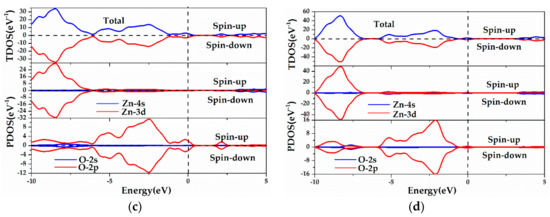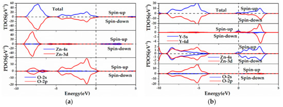 Figure 5 plots the total and the partial density of states (TDOS, PDOS) of the pristine, Y single-doped ZnO MLs and ZnO MLs with vacancy, and these parameters were applied to analyze the distribution and occupancy of each related orbit of Zn, O, and Y elements. As shown in Figure 5a, the VB consisted of two parts: the lower part was composed of Zn-3d and O-2p states, whilst the upper part was mainly dominated by O-2p states. The hybridization of the Zn-3d and O-2p states occurred in the VB, and the bonding states were formed in this energy region [18]. The CB was mainly ascribed to Zn-4s and O-2p states. Therefore, the antibonding states in the CB of ZnO ML comprised Zn-4s and O-2p states [18]. From Figure 5b, the VB mainly consisted of O-2p and Zn-3d states, the VBM was determined by O-2p states, and the CB was mainly composed of Y-4d and Zn-4s states, with limited contribution from O-2p states. In addition, the chemical bonding of Zn, O, and Y atoms caused orbital hybridization between the Y atom and adjacent Zn and O atoms, and the electron density overlaps will increase with Y doping, which plays a crucial role in controlling the chemical properties of Y-ZnO. This process will also lead to the splitting of the donor energy level and expansion into an impurity band. Therefore, Y doping has a great impact on ZnO ML conductivity. In addition, the TDOS was asymmetrical, indicating that the spin-polarization mainly originated from the 4d electrons of the Y atom. For VZn-ZnO and VO-ZnO, the bandgap of ZnO ML was mainly determined by Zn-4s states in the CB and O-2p states in the VB. For oxygen vacancy, the VBM and CBM moved to a lower energy region, the presence of VO resulted in the splitting of the VB into two narrower bandgaps (−2 eV and 0 eV), as shown in Figure 5d. The upper energy level was located in the forbidden band, which is induced by oxygen vacancy [31]. The new energy level is beneficial to the transition of electrons under low-energy incident light. Moreover, vacancy could change the conductivity of ZnO ML by changing the carrier concentration near the Fermi level, which is similar to that of Y doping.