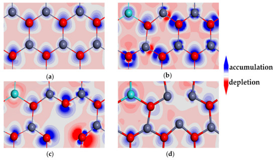 Figure 8 depicts the charge density differences of ZnO ML and Y-doped ZnO ML with or without vacancy. As shown in Figure 8b, the charge density distribution changed obviously with Y doping. The electron densities around Zn2+ (1.00 e) and Y3+ (1.14 e) ions are different, which can be seen from the Mulliken charge in Table 2. The incorporation of Y and vacancy into a crystal induced modifications of the electron density distribution in the space between crystal lattice ions, as provided in Figure 8c,d [61]. This result indicates that the covalent bond characteristic between Y and adjacent O atoms in Y-VZn-ZnO was stronger than that in Y-ZnO and Y-VO-ZnO because of the overlap of electron clouds and a strong interaction. In addition, the electron cloud overlap of Zn-O bonds near the VZn in Figure 8c was significantly greater than that near the VO in Figure 8d. The Zn-O bond near the VZn was more covalent, indicating that the electron transfer between the Zn atom and the adjacent O atom near the VZn was less than that near the VO.