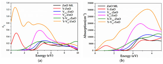 (a) The imaginary part of dielectric function and (b) the absorption coefficient of ZnO ML, Y-ZnO, VZn-ZnO, VO-ZnO, Y-VZn-ZnO, and Y-VO-ZnO.
