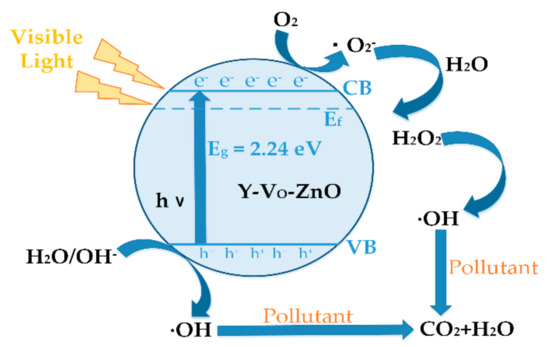 Figure 10 shows the mechanism of the electron-hole pairs transfer in Y-VO-ZnO, leading to the catalytic degradation of pollutants under visible light irradiation. When Y-VO-ZnO is illuminated by sunlight, the electrons in the VB are excited by photons to jump to the CB, and the corresponding holes are retained in the VB. Photo-generated electrons and holes are separated by an electric field and move to the surface of semiconductor particles. The photo-generated pores have strong oxidizing properties and can oxidize substances adsorbed on the surface or solution of the semiconductor [2].