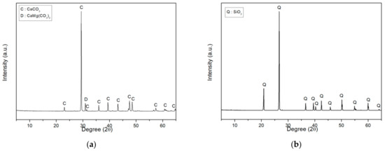 In this study, four types of fillers were employed. These fillers can be categorized into either crystalloid or blast and amorphous fillers. Ground calcium carbonate (GCC) and silica flour (SF) were used as crystalloid fillers. Fly ash (FA) and blast furnace slag (BFS) were employed as amorphous fillers. Density was tested via ASTM D 7481-18: Standard Test Methods for Determining Loose and Tapped Bulk Densities of Powders using a Graduated Cylinder [21]. Particle size and chemical composition were analyzed by LS 13 320 (Beckman Coulter Inc., Brea, CA, USA) particle size analyzer and X-ray fluorescence (XRF, Rigaku Co., Akishima, Tokyo, Japan), respectively. The properties of these fillers are shown in Table 4 and Table 5. Their X-ray diffraction (XRD, Rigaku Co., Akishima, Tokyo, Japan) spectra are shown in Figure 1 and Figure 2.