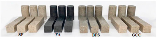 Specimen shape, depending on the type of filler; silica flour (SF), fly ash (FA), blast furnace slag (BFS), and ground calcium carbonate (GCC).