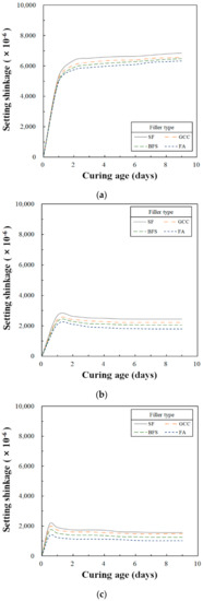 - The setting shrinkage was generally stabilized from 12 to 24 h after casting was completed. As the SRA content was increased, the setting shrinkage tended to decrease significantly, and there was no significant difference in setting shrinkage based on filler type.