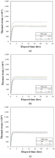 Variation of thermal strain as function of elapsed time for type of filler: (a) SRA content is 0%; (b) SRA content is 10%; (c) SRA content is 15%.