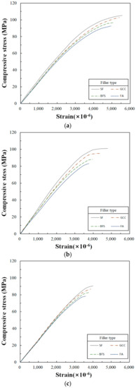 Compressive stress–strain curves by filler types: (a) SRA content is 0%; (b) SRA content is 10%; (c) SRA content is 15%.