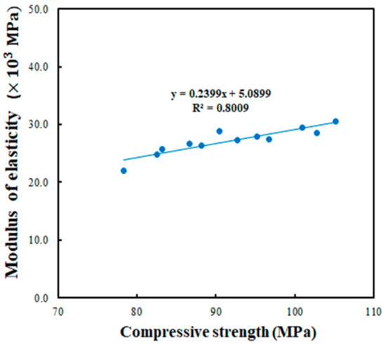 The relationship between the compressive strength and modulus of elasticity of all the obtained data regarding UP polymer concrete is shown in Figure 7. From these results, it was determined that the modulus of elasticity increased when the compressive strength was increased. The equation for the compressive strength and modulus of the elasticity is shown below. This equation can be useful to estimate the modulus of elasticity when the compressive strength was determined.
