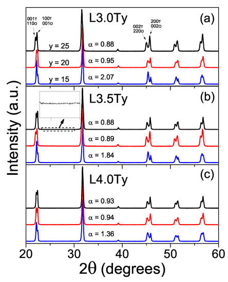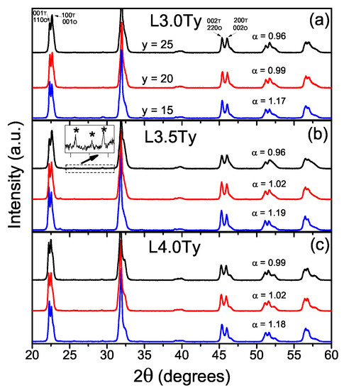 Considering the results for L3.5T20, 1110 C was chosen as the adequate temperature to process LKNNT ceramics of all compositions. Figure 6 shows the XRD patterns of these ceramics and the calculated parameter for each composition. Perovskite single-phase materials with no evidence of secondary phases were consistently obtained. Values of ranged from 2.07 and 1.84 for the L3.0T15 and L3.5T15 compositions, indicating orthorhombic phase (a minor tetragonal phase developed for L4.0T15), down to ∼0.88 for L3.0T25 and L3.5T25 showing mainly tetragonal phase in coexistence with a minor orthorhombic one. As main trend, the tetragonal fraction increased with the Ta content, consistently with previous reports [23].