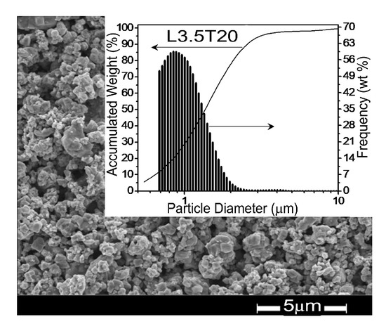 SEM micrographs were taken for all the powders after the final 24 h ball milling, in order to characterize the initial morphology and particle size before the sintering process. No significant differences among powders with different compositions were observed. A representative micrograph corresponding to composition L3.5T20 is shown in Figure 2, along with the particle size distribution obtained with a Sedigraph Micromeritics 5100. Unimodal particle size distributions with average between 0.8 and 1.2 m resulted with no systematic trend with LKNNT compositions.