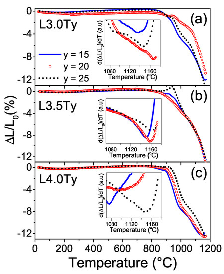 Relative shrinkage and its derivative (inset graphs) as a function of the temperature and Ta content y for the LKNNT powders with compositions (a) L3.0Ty, (b) L3.5Ty and (c) L4.0Ty.