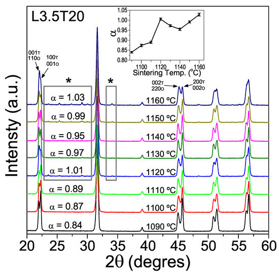 XRD patterns for ceramics with composition L3.5T20, sintered at different temperatures for 2 h. The 001, 100, 002 and 200 peaks of the tetragonal phase were identified with the (T) letter, while the 110, 001, 220 and 002 peaks of the orthorhombic phase were identified in with the (O) letter. Asterisks mark peaks belonging to the secondary phase KLiNbO. Inset graph shows the evolution of the parameter with the sintering temperature.