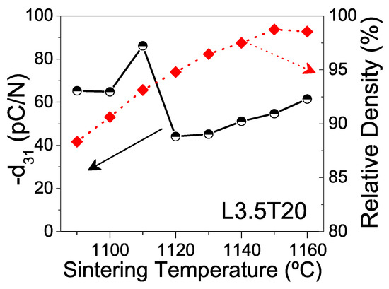This chemical deviation that gives rise to changes in the phase coexistence must also affect properties. Figure 5 shows piezoelectric coefficients d, functions of the sintering temperature for ceramics with composition L3.5T20. Relative densities are also included. Densification continuously increased with temperature, up to high values ranging from 97% up to 99% for temperatures between 1140 and 1160 C. However, the maximum piezoelectric coefficient d was attained in the ceramic sintered at 1110 C, which had a fair relative density of 93%. Indeed, there was a sharp fall in the piezoelectric coefficient d when the temperature rose up to 1120 C. This is consistent with the shift in phase coexistence, and thus confirms 1120 C as the temperature, at which volatilization of alkaline elements starts resulting in loss of stoichiometry, formation of secondary phases and degradation of the piezoelectric coefficient.