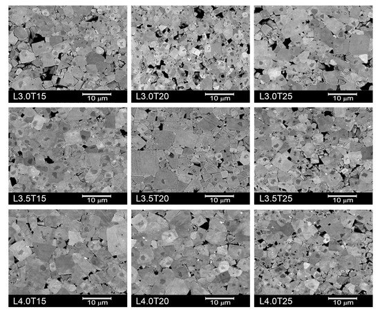 SEM micrographs for all the LKNNT ceramics sintered at 1110 C are shown in Figure 7. Ceramics L4.0T15 and L4.0T20 showed the lowest porosity fractions, in agreement with their lower temperatures of maximum shrinkage rate, as revealed by the dilatometry results (see Table 1). Note that these two compositions were the only ones for which said temperature was below the onset one for alkali volatilization, and thus, below the temperature used for sintering (1110 C). Additionally, all ceramic materials showed grains with core-shell structure, which is frequently observed in LKNNT materials [31,34,37,47] when conventional solid state synthesis from alkaline carbonates and Ta and Nb oxides is carried out. It has been associated with compositional inhomogeneities, so that Nb- and K-rich cores are surrounded by Ta-rich shells [31].