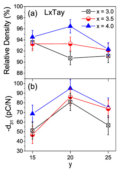 Figure 8 shows the piezoelectric coefficients d for all the LKNNT ceramic materials, along with their relative densities. Error bars here and in Figure 9 and Table 2 correspond to the dispersion of values among five L3.5T20 ceramic samples sintered at the same temperature of 1110 C. Compositions L4.0T15 and L4.0T20 presented the highest relative density with values above 94%, consistent with the SEM and dilatometry results as discussed above. Densifications between 90% and 94% were attained for the remaining materials, whose temperatures of maximum shrinkage rate were above the sintering temperature. Recall that even if one could raise densifications by increasing sintering temperature, this would trigger the volatilization of alkaline elements and degrade piezoelectric properties, as shown for the L3.5T20 composition (see Figure 5).