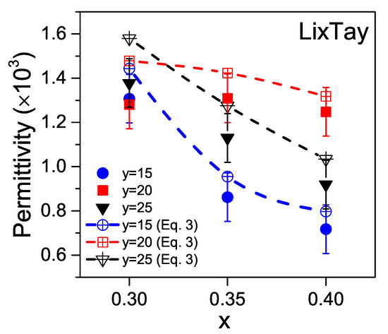 Composition dependence of the dielectric permittivity, at 25 C and 1 kHz, for the LKNNT ceramics, sintered at 1110 C for 2 h. The permittivity values for zero porosity, calculated from Equation (3), were also added and they are represented by open symbols. Dashed lines are guides for the eye.
