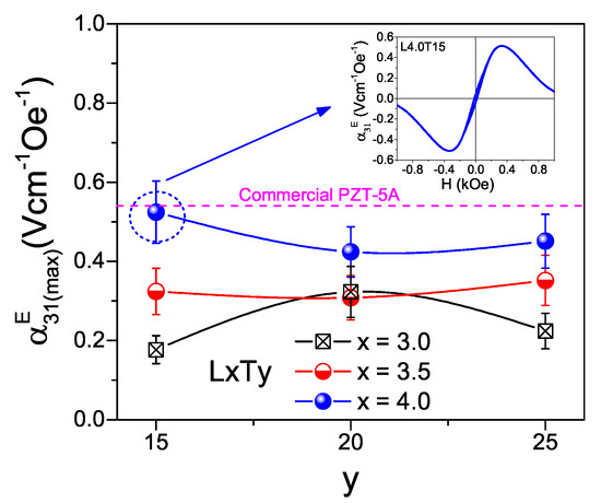 2D simulations were used to scan all compositions, because they already capture all the physics and allow the optimum composition to be identified, while saving calculation time. Transverse ME coefficients were obtained as a function of the static magnetic field. An example is given in the inset of Figure 10. A maximum was obtained at a given bias field, which corresponds to the maximum slope in the magnetostriction curve, and is thus characteristic of the magnetic material [43]. Ideal interfaces were assumed; i.e., strain generated in the spinel oxide under the magnetic field is fully transmitted to the perovskite layers. Maximum ME coefficients as respective functions of the compositions of the piezoelectric phases (LxTy) are given in Figure 10 for composite CFM25/LxTay/CFM25 structures of 1 mm single-layer thickness (t) and 10 mm length (L). Error bars were obtained by standard error propagation of those associated with the material coefficients given in Table 2 (defining the dispersion of values among five analogously processed piezoelectric ceramics). Composites with piezoelectric phases LxTay having x = 4.0 show the highest values. Note that this a consequence of their comparatively low dielectric permittivity. Indeed, the largest ME response occurs for composition L4.0Ta15 that has the lowest permittivity, even if its d coefficient is lower than that of most compositions (see Figure 8b). This reflects the complex interplay between composition, processing and properties, along with the role of other properties such as dielectric permittivity and compliance coefficients in maximizing the ME coefficients of composites [39]. In fact, L4.0Ta15 sample also has a relatively low s value (see Table 2), which is advantageous for the ME response, as commented on above.