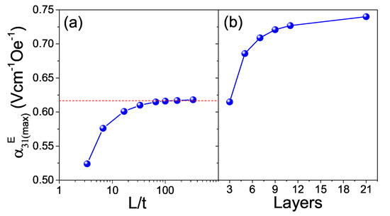 The magnetoelectric response of a layered composite depends on geometry, an effect that can be easily investigated by simulation. Figure 11a shows how the maximum transverse ME coefficient of the model three-layer structures evolves when the ratio between length L and thickness t (L/t) is increased. These simulations were done for CFM25/ L4.0Ta15/CFM25 structures, and a gradual increase of with the L/t ratio was found, up to a saturation value of 0.62 VcmOe, which occurs at approximately L/t = 66. Moreover, is further enhanced by increasing the number of layers, while maintaining L/t. This is illustrated in Figure 11b, which shows of composite multilayer structures of CFM25 and L4.0T15 with L/t = 66 as a function of the number of layers. Indeed increases from 0.62 up to 0.74 VcmOe when the number of layers is increased from 3 to 21. This is partially due to the increment of the piezoelectric volume fraction with the number of layers, from 0.33 to 0.5, at which analytical solutions predict the maximum response [1,41]. Overall, these simulations nicely illustrate how geometry can be tailored to considerably improve the responses of ME composites. Specifically, the magnetoelectric response of composite CFM25/L4.0T15 layered structures can been increased by 42% (from 0.52 to 0.74 VcmOe) by increasing aspect ratio and multilayering.