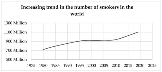 Figure 1. Increased rate of the number of daily smokers in the world from 1980–2019; adapted from the Institute for Health Metrics and Evaluation (2014) and World Health Organization [3,4].