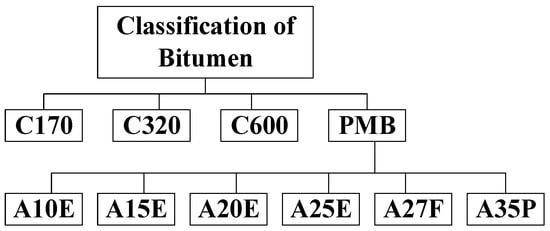 Bitumen is a viscoelastic complex hydrocarbon that is black or brown. Although there are a few natural sources of bitumen available, bitumen is generally sourced from crude oil refineries [25]. Because of its waterproofing and viscoelastic nature, bitumen is used as the binder for the construction of flexible pavement all over the world. Bitumen can be classified into three categories: penetration grade, performance grade, and viscosity. Nowadays, bitumen classification based on the viscosity grade is gaining popularity, and the available types according to the Australian Standard which is named after the typical viscosity of bitumen at 60 °C except for PMB class (polymer modified bitumen) for the construction of flexible pavements are provided in Figure 4 [26].