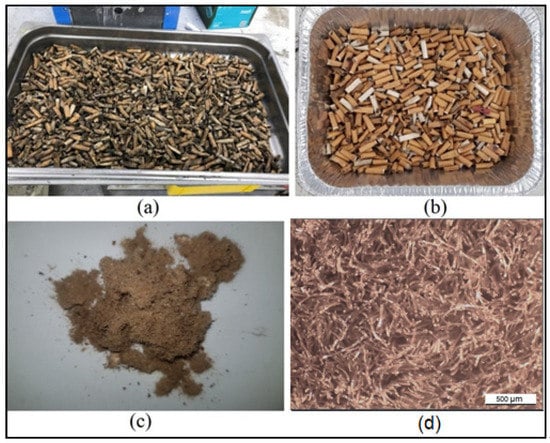 Figure 5. Cigarette butts (a) before and (b) after oven drying and the removal of excess tobacco and dirt; (c) ground cigarette butts (CBs) used for sample preparation; (d) view of CB fibers under optical microscope.