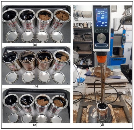 Figure 6. (a) Bitumen C170, (b) Bitumen A10E, (c) Bitumen C320, and (d) blending of bitumen with fibers using the shear mixture.