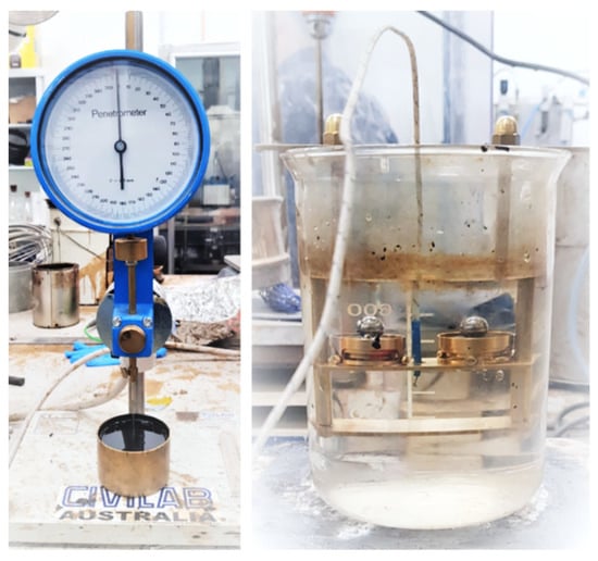 The penetration test was carried out according to AASHTO T 49 and AS 2341.12. During the test, samples were collected in penetration cups and conditioned in the water bath at 25 °C temperature for 2 h. Later, a penetrometer was used to determine the penetration value of the samples. The results were compared with the control sample without any fiber. Figure 8 shows the penetration test of a sample in the laboratory.