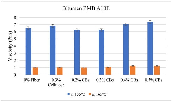 The results show a positive resemblance in the viscosity of the samples. In the case of PMB A10E, the control sample without any fibers, the viscosity was 6.49 Pa. s at 135 °C. However, when PMB A10E was modified with cellulose fibers, a slight increase in viscosity was noticed. When it was modified with shredded CBs, an increase in the viscosity was found with the increase in the quantity of CBs in the mixture. The presence of the polymer content in the bitumen has a vital role in terms of higher viscosity.