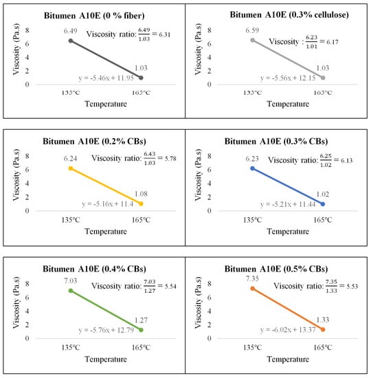 The viscosity ratio of the samples prepared with bitumen PMB A10E shows that the addition of 0.3% CBs in the binder has the highest viscosity ratio of 6.13 among other modified bitumen samples. In terms of temperature susceptibility, 0.3% CBs in bitumen keeps the binder very similar to the control sample. Considering the slope condition, the sample with 0.3% CBs has the slope closest to the control sample as well.