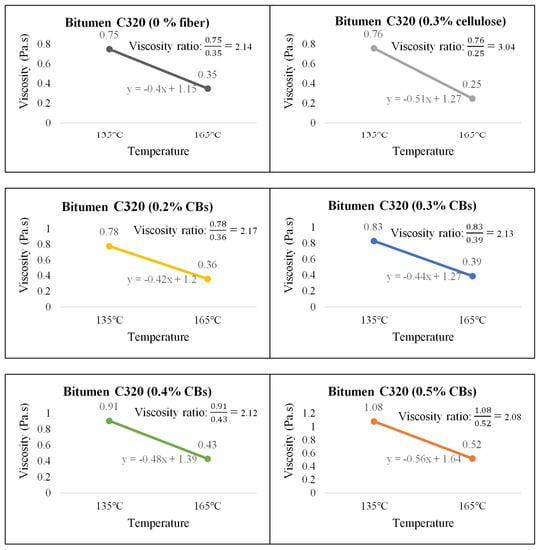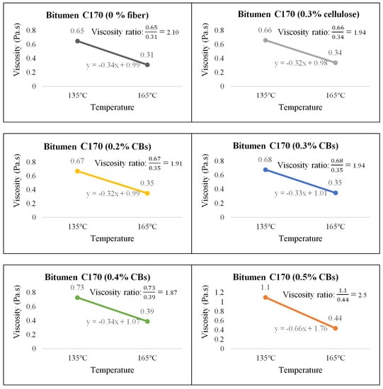 The viscosity test has enhanced the understanding of the rheological behavior of the samples. Although the addition of fiber has slightly increased the viscosity of the samples compared to the control sample without any fiber, the results are within the range for typical values. The temperature susceptible slope shows that the pattern of viscosity changed with temperature. In the case of PMB A10E, C320, and C170 it was found that when the samples are modified with 0.5% CBs, viscosity increased significantly because fibers work as reinforcement in the binder mixture. It can be concluded from these results that 0.3% CBs as fiber can be used to modify bitumen without compromising the required properties for use in the construction of flexible pavements.