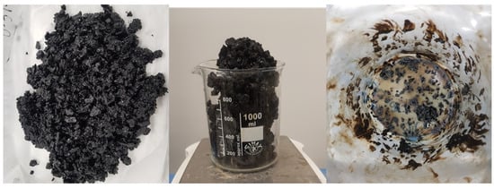 Figure 16. Binder drain off process. Asphalt mix prepared with CBs modified bitumen (left); preparation of binder drain off test (middle); drained off binder with fine aggregates retained at the bottom of glass flask (right).