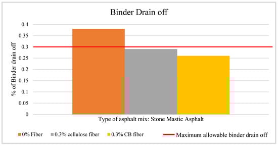 Table 8 shows the results of the binder drain off tests. The bitumen sample prepared with 0.3% CBs fiber shows 0.26% of binder drain off, while the sample prepared with conventional cellulose fiber has 0.29% of binder drain off. These results show that the CBs modified binder has a lower drain off; hence, the loss of binder during transportation will be less. The industry maintains a maximum binder drain off of 0.3% [26,40]. Figure 17 shows the relative difference in the percentage of binder loss with the maximum recommended limit practiced by industry, which helps one to understand the significance of the use of CBs in bitumen as fiber in terms of improving the binder drain off property.