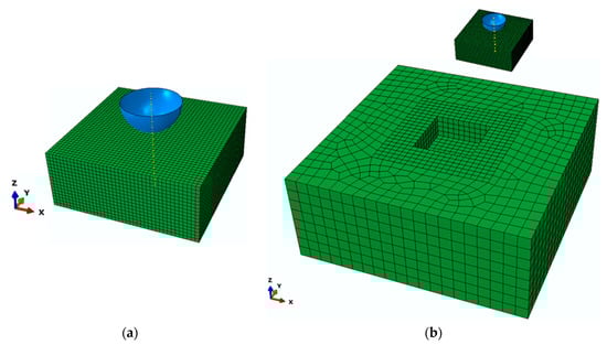 The numerical model of the nanoindentation test: (a) with indented solid mesh discretization; and (b) with an outer cube to enclose the indented grain.