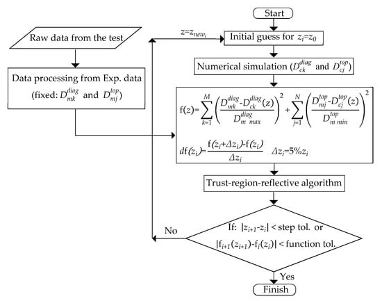 The solution of inverse problems relies upon classical optimization techniques. The proper technique depends on the type of function to be optimized and constraints between parameters. Trust region algorithms are a class of relatively new algorithms [59,60]. The trust region approach is strongly associated with an approximation. In fact, most line search algorithms can find the approximate models using search directions. However, in a trust region algorithm, the discrepancy function is approximated from a nearby region of the current iteration. This seems reasonable because, for general nonlinear functions, local approximate models (such as linear approximation and quadratic approximation) can only fit the original function locally [61]. Since the trust-region-reflective method is a derivative-based algorithm, the converged solution is obtained with fewer iterations compared to other nonlinear optimization methods. For example, in Bayesian optimization using Gaussian process regression, the objective function is unknown and it does not need to calculate the derivatives and these two features increase number of required iterations in optimization process for reaching the converged solution [62].