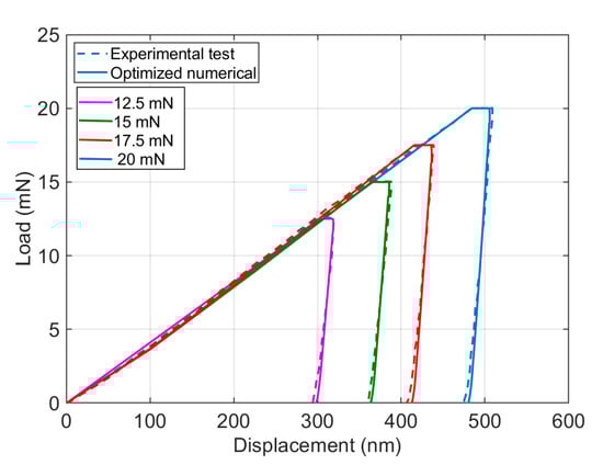 Comparison of load–displacement curves of the experimental test and numerical model using identified parameters (initialized based on the literature) for the forces of: (a) 12.5 mN; (b) 15 mN; (c) 17.5 mN; and (d) 20 mN.