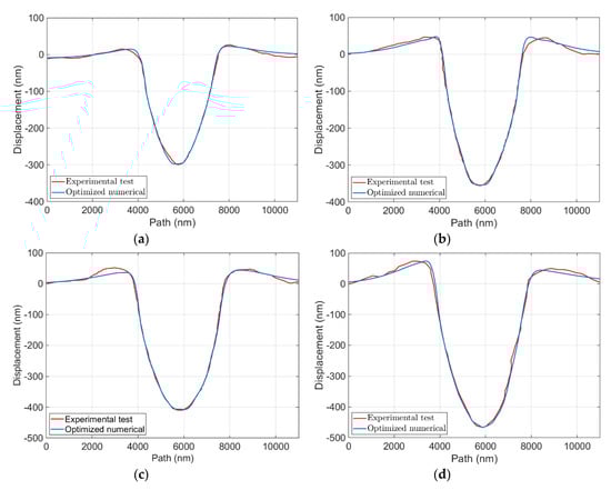 In the above relationship, superscripts and indicate the displacements from load–displacement diagrams and from the surface topologies, while subscripts and refer to measured and computed quantities, respectively. In particular, and in the left side parentheses indicate the displacements on the load–displacement curve from the experimental and the numerical results for the number of M points on the load–displacement graph, and their subtraction is normalized by , which is the maximum measured displacement from the experimental test. In the right side parentheses, and represent the surface imprints from the experimental and the numerical output for the number of N points on the surface topology diagram, while indicates a normalization term, here assumed to coincide with the minimum measured displacement from the surface imprint experienced at the applied load.