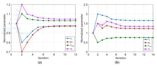 The trend of changes in the considered parameters during the optimization procedure using different initial data (literature and arbitrary data) is shown in Figure 5. It is worth noting that the parameters visualized in Figure 5 were normalized by dividing them with their initial value.
